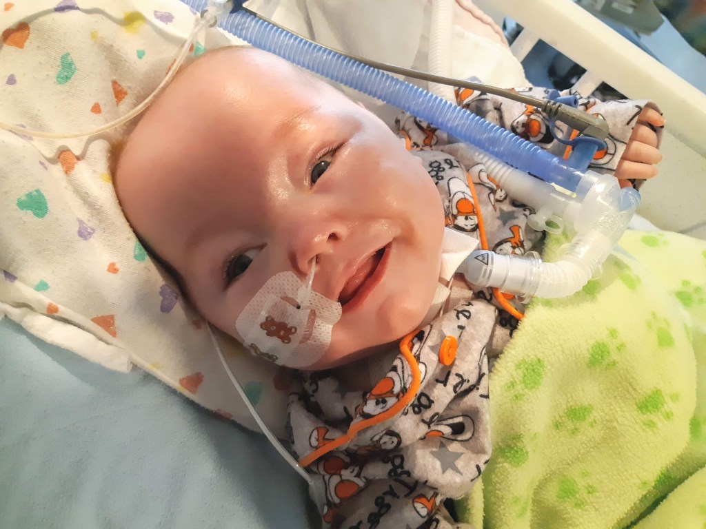 Calvin’s blood gas yesterday morning showed a low pH level so they put him back on the ventilator for about 12hrs. They switched back to the trach mask last night and he’s been doing alright so far. They were planning to move him to the paeds floor today but are going to keep him in PCCU for one more night because the G-tube/J-tube nurse practitioner (for the paeds floor) is not here. He is up to full feeds now (27mL every hour continuous) and handling this well, and he is on a spurt of no pain meds at present!