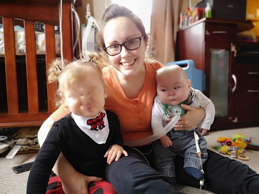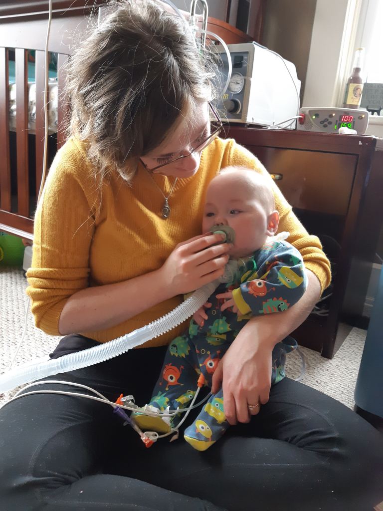 It has been quite an adjustment for Corey and I as we do our best at adapting Calvin’s routine to our daily family life. It was overwhelming the first few days but we are slowly getting the hang of things! Every day, Calvin has chest physio, nebulizer treatments, trach care, multiple medications, G-tube and GJ-tube care, temperature checks and 18 hours of feeds – all on top of the regular baby stuff like baths, diaper changes, etc. He has a monitor that reads both his heartrate and oxygen saturations when he is hooked up to it and a suction machine we use to clear secretions from his trach as often as needed. We have night nursing from 11pm through until 7am so we can sleep.